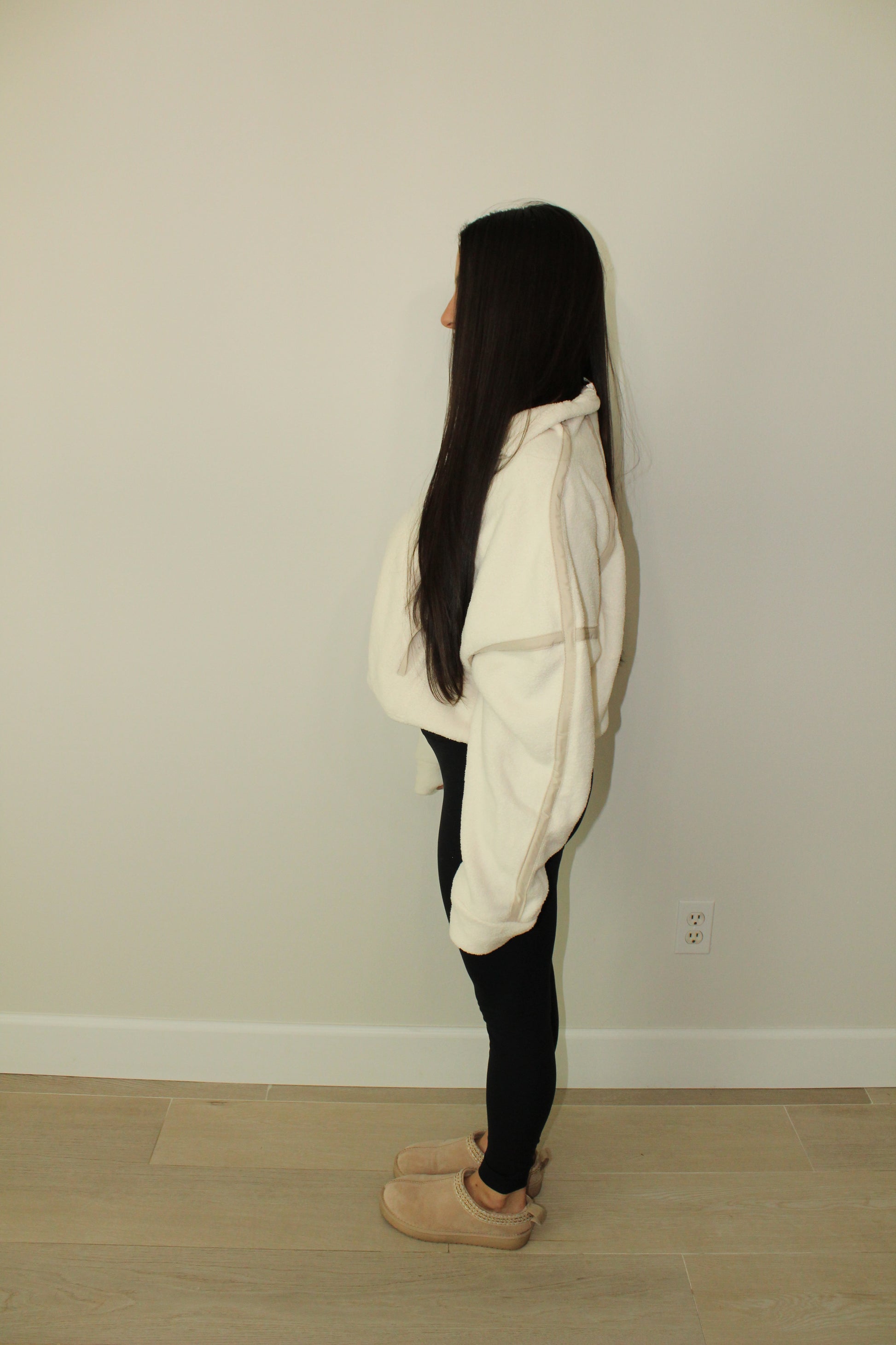 This modern half-zip jacket offers a stand-up collar and large patch pockets for functional style. Its relaxed fit makes it perfect for layering over tees. Style it with skinny jeans or leggings for a casual look, ideal for chilly outdoor activities or a cozy night in. Designed In The USA